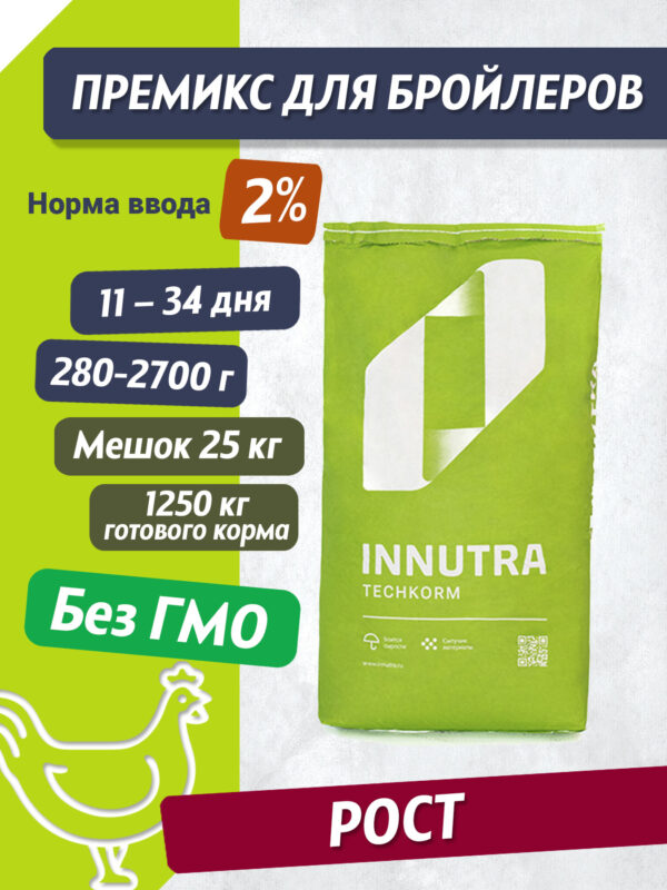 Премикс для составления комбикормов бройлеров. Фазы применения: рост; Способ дозировки: 20 кг на 1 тонну готового комбикорма; Использовать совместно с основными компонентами кормосмеси для получения комбикорма сбалансированного по витаминно–минеральному составу.