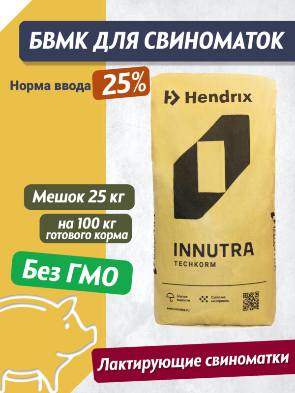 рекомендуется смешивать с зерном (пшеница, ячмень, овёс, горох и др.) в соотношении 75% смеси + 25% БВМК.